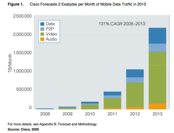 What is driving this growth is video. Cisco forecasts that 90 percent of consumer IP traffic (which makes up the majority of total IP traffic) will be video in 2013. Cisco also predicts that mobile data traffic will also be overtaken by video, reaching 64 percent of total mobile IP traffic by 2013. Part of this might be wishful thinking on Cisco’s part, which needs broadband usage growth to continue apace in order to sell its networking gear. But part of it is also the fact that these numbers are based on the percentage of bits traveling over those broadband pipes, and it doesn’t take a lot of fat video files to fill those up.