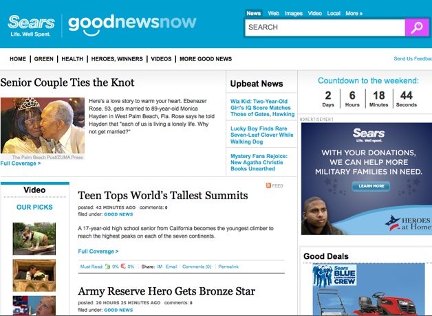 Are you tired of all the depressing headlines every day about bombings, layoffs, and financial collapse? Sears sure is. Its “Life. Well Spent.” ad campaign just doesn’t work next to downbeat stories. What if there was a news site that only ran good news? Well, that wouldn’t really be a news site, but Sears decided to create one anyway in partnership with AOL News. It is called Good News Now, or GNN.