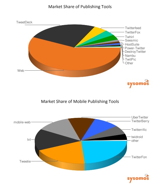The study also broke down the market share of Twitter clients, both desktop and mobile. More than half of all users (55 percent) use a Twitter app. The most popular way to use Twitter is through the Website (45 percent), followed by TweetDeck (19 percent). Twitterfon and Tweetie are the two most popular mobile apps and the No. 3 and No. 5 most popular ways to use Twitter overall, with 4.5 percent and 3.7 percent market share, respectively. Twitterfeed, which people use to submit RSS feeds to Twitter and which was purchased today by Betaworks, was the No. 4 client with 3.8 percent share. (Here are more up-to-date cient usage stats from TwitStat).