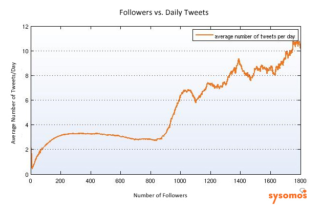Oh, the burdens of popularity. We already know that most people on Twitter are sheep with few followers and who don’t Tweet much. But what about the rams? If you want to lead a flock on Twitter, you need to be heard. People with 100 followers send out an average of 2.4 Tweets per day, while those with 1,800 followers Tweet an average of 10.2 a day, according to a new study by Sysomos, a social media analytics company based in Toronto. The inflection point seems to be between 800 followers (2.8 Tweets a day) and 1,000 followers (6.4 Tweets a day).