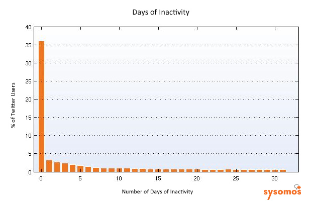 More broadly, 50 percent of people on Twitter send out updates less than once a week. But 36 percent of the accounts Sysomos tracks send out Tweets every single day. So about a third of people on Twitter are fairly active, dedicated users. While half are more passive desk potatoes, Tweeting less than once a week.