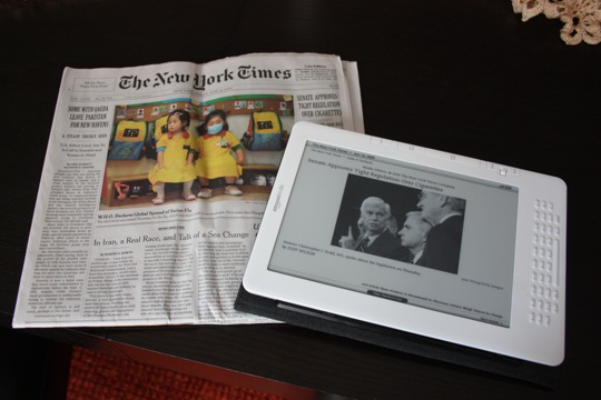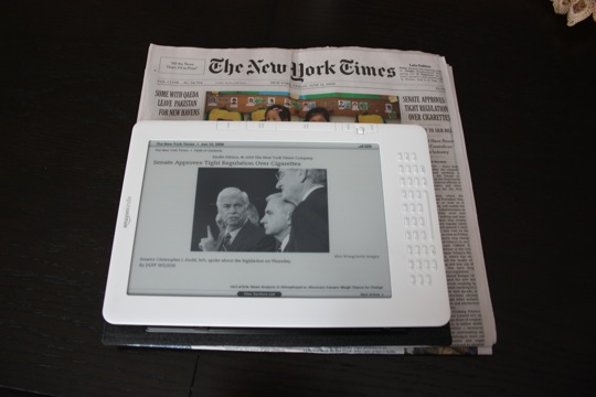 Why am I interested in the Kindle? Well, I already have a first-gen Kindle so I’m not too keen on upgrading immediately. But I’ve been waiting for Amazon to solve something with the Kindle DX that has been nagging me for quite a while. You see, I have a problem. I don’t want to read the New York Times on paper anymore but paper seems like the only logical way to read it. Reading the newspaper on a gadget is rude and dangerous – especially with toddlers around the house. It’s a tough sell to have a gadget at the breakfast table. But then I know that I’ll never read it on the desktop whether through the Times Reader or any other source. So the DX sounded great. I has all of the features of the current Kindle plus rotational sensing and a beautiful, huge screen that might just fit the entire NYT front page and not just one article. So that’s why I wanted to see the DX.