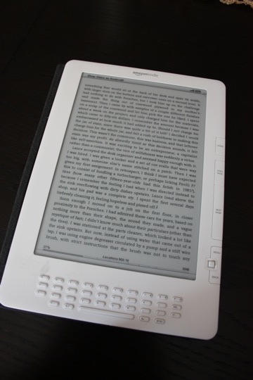 First the cons. The Kindle DX is heavy. It’s heavier than the original Kindle by over nine ounces. It’s not much, but clearly Mosso and I share a strange affliction called “Ouch, our wrists hurt holding this thing.” It’s a big device. It works best on a table.