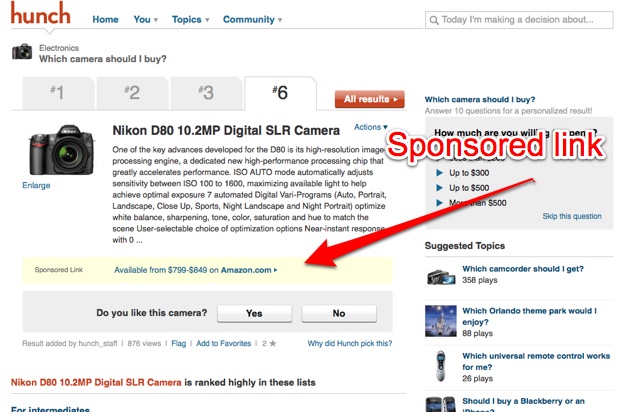 Fake estimates that about 40 percent of the topics on Hunch right now are monetizable with ads or affiliate links. If you try to use Hunch to figure out which camera you should buy, for example, and the answer turns out to be the Nikon D80, already you will see a sponsored affiliate link to Amazon. Other business models might emerge in the future.