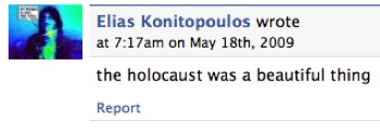 The Facebook Holocaust denial debate rages on. Facebook’s position is clear, Holocaust denial groups and content is fine (nipples aren’t): “Just being offensive or objectionable doesn’t get it taken off Facebook. We want it [the site] to be a place where people can discuss all kinds of ideas, including controversial ones.”