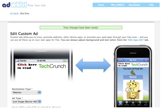 AdWhirl, which is available to developers for free, offers developers a platform where they rotate between ad networks and specify how often they’d like their ads to appear in their application. Developers can also set up AdWhirl to automatically switch between all available ad networks, optimizing CPM rates to ensure that their apps are generating as much revenue as possible (it can also fill an ad unit when the current network runs out of inventory, which can be a problem on popular applications). Developers can also create customized advertisements and include these in their package.