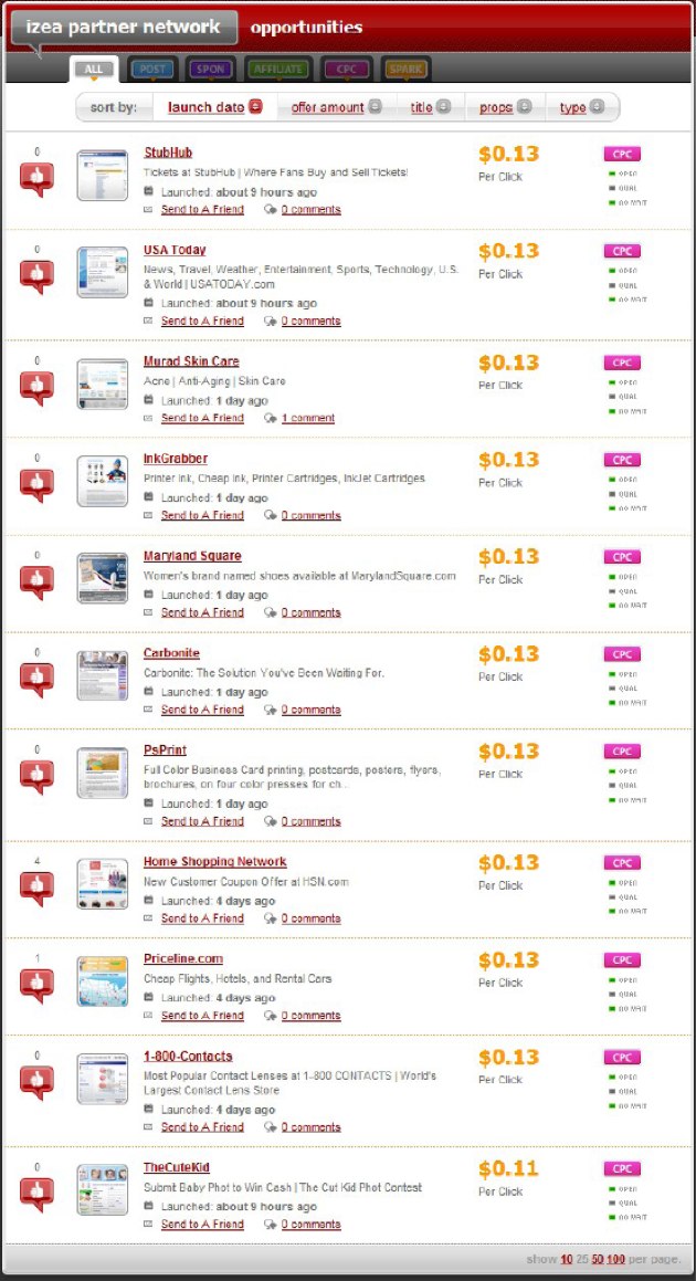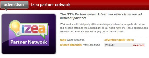 Izea pulled them in through Commission Junction, an affiliate marketing company, via a program they are testing called the Izea Partner Network: “Izea works with third party affiliate and display networks to syndicate unique and exciting offers to the SocialSpark social media network. These opportunities are only CPC and CPA and are largely performance driven.”