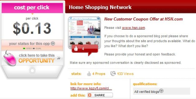 The result? Brands like Home Shopping Network, who have no relationship with Izea, are spammed across Twitter and blogs with $0.13/click links.