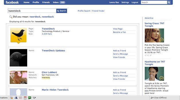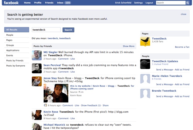 The ability to search my personal stream with results coming back in chronological order is key. This is how Facebook will do real-time search. For instance, if I want to see what my friends think about the new TweetDeck apps which just launched tonight, I can see all their comments on the subject, followed by comments from everyone with a public feed whether they are my friend or not. In the right-hand column are page and people results.