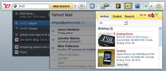 Yahoo also made search faster from the toolbar, incorporating some search assist technology from its Inquisitor acquisition. It suggests refined queries as you begin typing and sites that you’ve clicked on in the past. (The Inquisitor app for the iPhone is also worth checking out).
