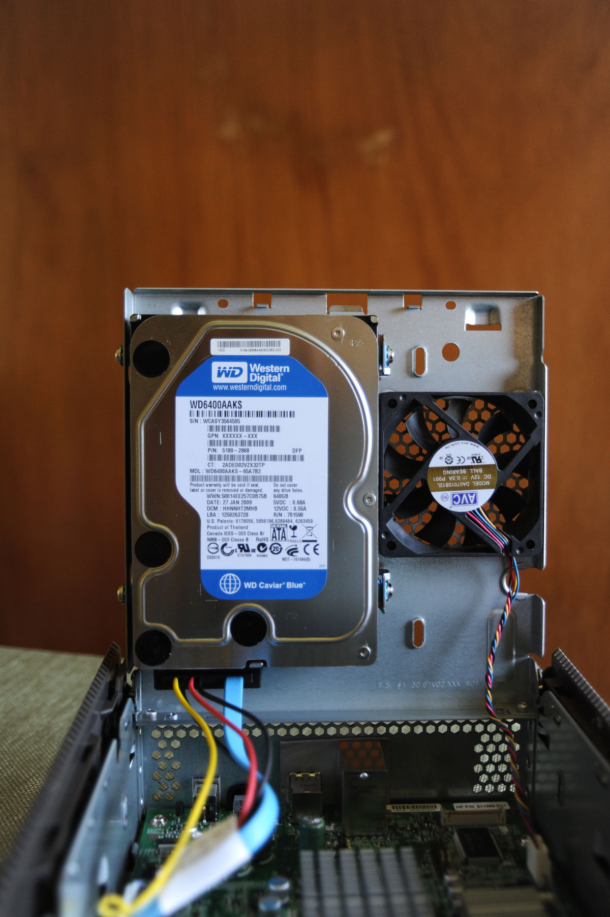 HP didn’t design the the LX195 to be expandable, but just four screws prevent users from accessing the insides. In fact, the hard drive and exhaust fan swings out on one of the side panels, revealing the motherboard. (more pics below) I don’t see why you couldn’t add a larger hard drive as long as you can reinstall the OS.