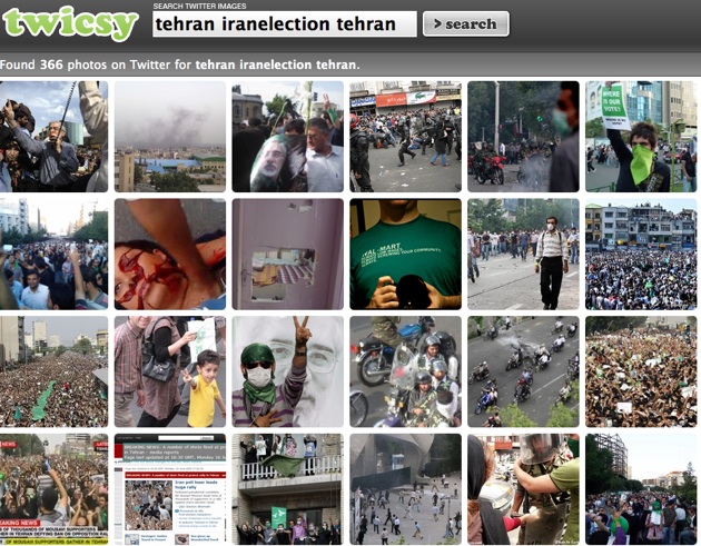 Since it is difficult to find photos in the sea of Tweets using the same #iranelection tag I’ve been using Twicsy, an image search engine for photos posted to Twitter which we wrote about yesterday. If you search “iranelection” or “tehran iran”, dozens of images from the protests will pop up.