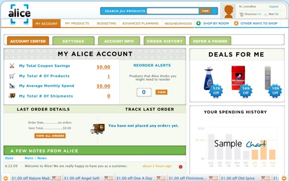 Of course, you pay your state’s tax on the item and you have to buy at least six items at a time, which can be annoying if you run out of certain items at different rates. But Alice saves your information so when you return to the site, it will calculate what you need and suggest items for you. You will also be able to choose free samples to add to your shipments from manufacturers. You can also review products on the site but you have to have purchased an item in order to submit a review. And you can publish your list to the site, if you want others to see what you’ve bought (which might not be that interesting considering all lists will be composed of household items). And to keep up with budget conscious users, Alice.com will chart your spending history over your orders.