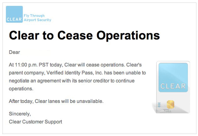 Clear, the largest company to leverage the Registered Traveler program in the U.S., has “ceased operation” as of 11 pm PST today and their parent company, Verified Identity Pass, Inc., is in the deadpool. They were “unable to negotiate an agreement with its senior creditor to continue operations.” Users were notified this evening by email.