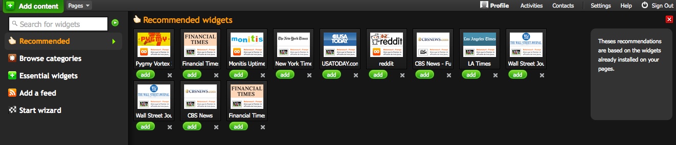 I personally have moved on from widgets to more linear streams of data as my information consumption habit of choice, but a lot of people still like widgets (see, iGoogle). Most widgets are really just a different way to package streams of data such as news or Twitter feeds. On Netvibes, you arrange them in boxes on your page, and can organize multiple pages in tabs, and even go beyond that. But at a certain point you stop adding new widgets just like you stop adding new feeds to your RSS reader because you don’t know what else to add or it simply becomes overwhelming. A good recommendation system could help you discover new widgets, but what is equally important is a way to clean up the widgets you added long ago but never bother to look at. Recommending what to get rid of is just as important as recommending what to add. But that is not part of the system yet.