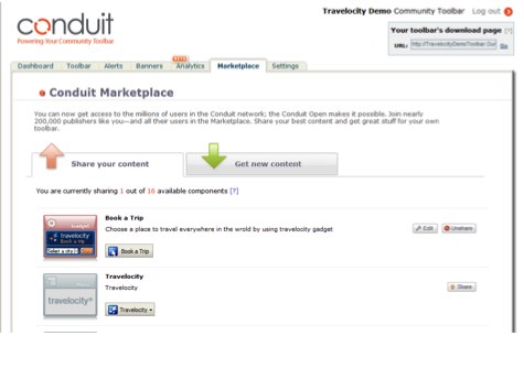 Conduit’s SaaS tool lets companies create and distribute their content and products on a custom community toolbar. Conduit, which we have covered previously here and here, has amassed a network of more than 200,000 web publishers who distribute their toolbars to more than 60 million users.