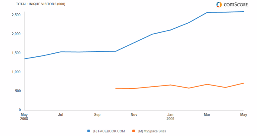 MySpace’s growth has been stagnating for quite some time now. Worldwide monthly page views for MySpace declined from 47.4 billion a year ago to 38 billion in April, a 20% drop. In that same period Facebook grew from 44 billion to 87 billion, a roughly 100% increase. MySpace’s user number growth has stalled out also, and developers are reporting that activity on MySpace is decreasing at a dramatic rate, as high as “half a percent a week.” And in our most recent model of the true value of social networks, MySpace fell below Facebook, dropping from the top spot last year.
