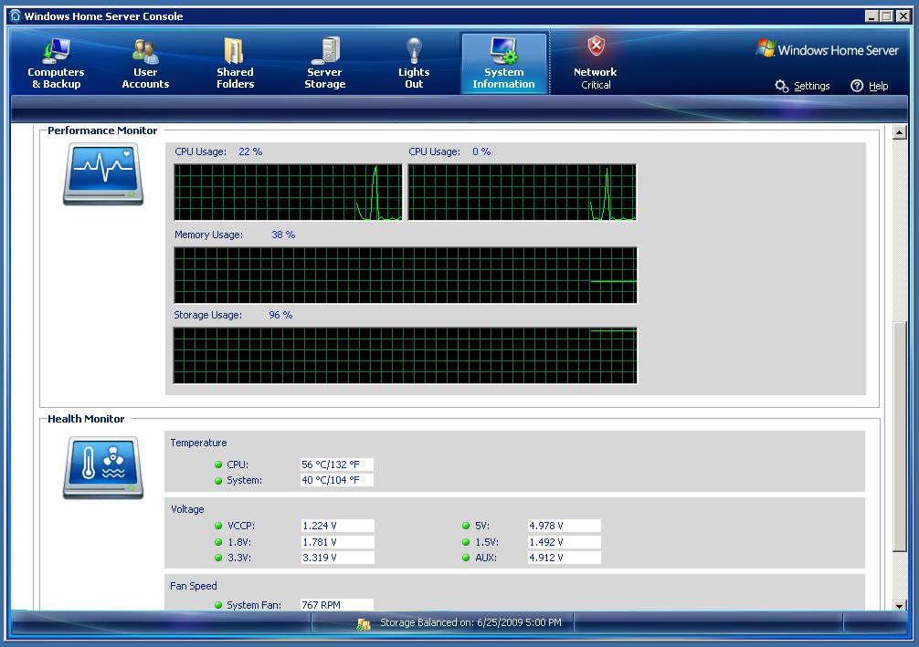 I was slightly concerned that the Atom CPU would disappoint me, but just like with the HP LX195, this guy works just fine. The low power-consumption CPU handled running uTorrent 24/7, unRARing, and backing-up just fine. I didn’t notice any hiccups or performance issues at all when using this server.
