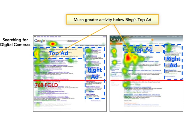 A search for a local hotel, however, produces similar results on both search engines in that area just below the top ads (a map with local listings). So there was not much difference between the two in the how much time was spent looking at the top ads related to that search. In all cases, the ads on the right were only noticed about half the time.