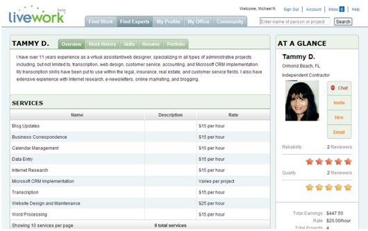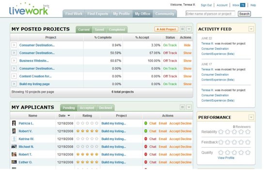 Livework is basically a marketplace for outsourcing projects. Any client can advertise the need for virtual work on the platform and work providers can find projects or advertise their services on the site. Companies can operate virtual service storefront, and can bid for workers. Each worker’s profile includes information about their work history, reputation etc.