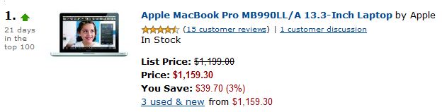 In case you didn’t know, Apple refreshed its notebook lineup a few weeks back and rebadged the 13-inch unibody Macbook as a Pro model. Apparently the masses like it as that model now occupies the top spot in Amazons best selling laptop computer list and number four overall. It wasn’t that long ago that netbooks ruled that second list and the white 13-inch Macbook was the top selling Apple computer at number 14.