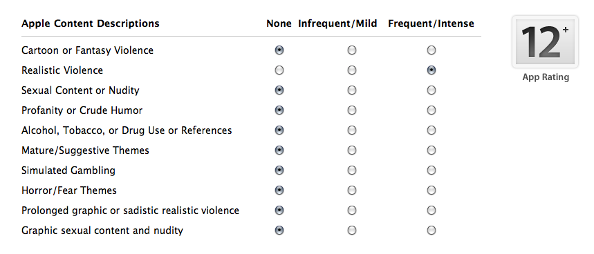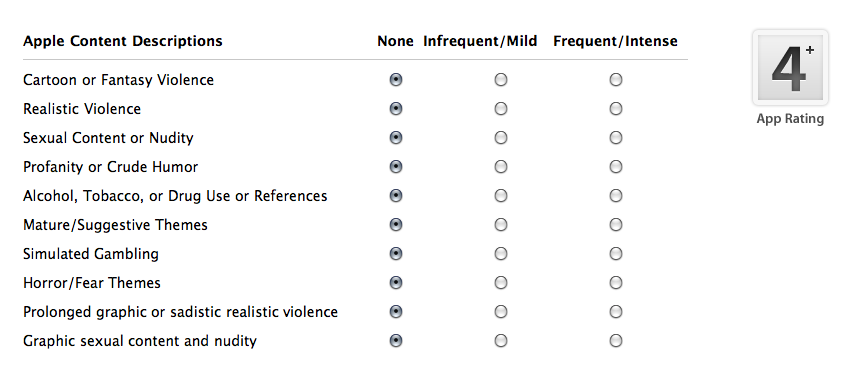 When you go to submit your app through iTunes Connect, one of the steps takes you to a ratings matrix that you must fill out. This contains 10 questions listed under “Apple Content Descriptions.” For each of the 10 questions you must say “None”, “Infrequent/Mild”, or “Frequent/Intense.” Depending on what answer you give for each of these, the rating of your app in the upper right corner will change. These ratings go from “4+” to “9+” to “12+” to “17+” to “No Rating.”