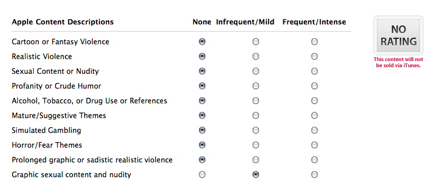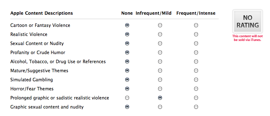 That last one is key. If your app gets the “No Rating” label, a warning written in red appears underneath it stating that: “This content will not be sold via iTunes.” So what triggers such a rating? Well, not a lot. Basically, it comes down to the final two questions in the 10 question matrix. Let’s run through them in descending order: