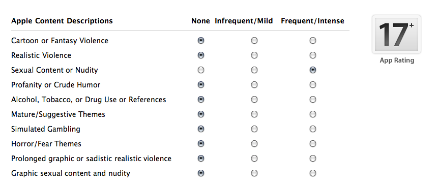 Second, you’ll notice that there’s a question about both “Sexual Content or Nudity” and “Graphic sexual content or nudity.” What’s interesting about this is that apps with “Sexual Content or Nudity” are still allowed — even if you select “Frequent/Intense” in that field. You’ll get a 17+ rating, but your app will still be allowed. However, if you click even “Infrequent/Mild” in the “Graphic sexual content and nudity,” your app is banned. I’m not sure what the difference is between “intense sexual content and nudity” and “mild graphic sexual content and nudity”, and neither do a lot of developers.