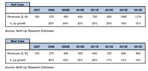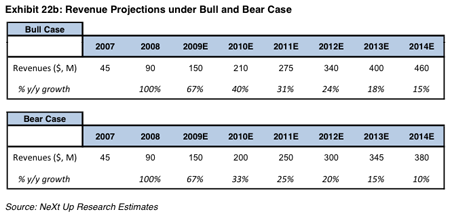 Using a steady-state growth valuation, the report projects that LinkedIn should be valued between $1.64B and $1.42B. Again, this is very dependent on revenue predictions: the Bull cases estimates that LinkedIn will have revenues of $460 million by 2014, while the Bear case uses $380 million for the same year.