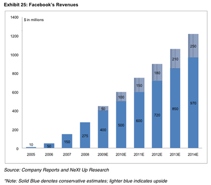 As a final measure of the social network’s worth, the report uses the most recent social network transaction, which was AOL’s $850 million acquisition of Bebo in early 2008. This valuation was around 17x Bebo’s 2008 revenue and 7.1x its 2009 revenue. The report uses the same multiples based on Facebook’s estimated 2009 revenue to generate a $3.15 billion valuation.