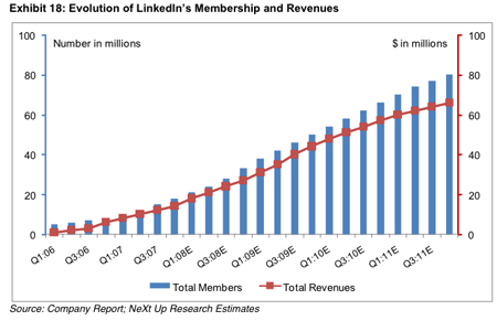 As with the Facebook study, the LinkedIn report uses the Bebo acqusition to generate a valuation (which I doubt is particularly accurate given the very different natures of the sites). By this metric, LinkedIn’s projected revenue of $210 million for 2010 would yield a valuation of $1.49 billion.