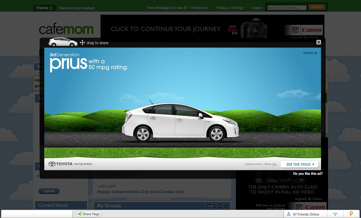 Visitors to one of the 85 partner sites which have implemented the Community IM product (including Current TV, DailyStrength, Flixster, and Webs.com) can chat with their IM buddies without leaving the sites. Today, Meebo is introducing new ad units which pop up along the bottom left of the browser, beginning with ads for the Toyota Piou and AT&Ts. For the Toyota ad, a little car icon pops up on the left of the Meebo IM bar, away from all of the chat activity on the bottom right. If you click on the car, a larger ad 900X400 pixel rich ad overlay opens up which can show a video or any number of interactive ads. “When they click we do not take them away from the conversation,” says Sternberg. During the whole time people is watching the ads, they can still chat with their friends through the Meebo IM column on the right.
