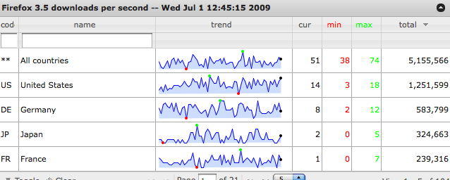 In the first 24 hours since its release yesterday, Firefox 3.5 has been downloaded more than 5 million times. (It took only a few hours to pass a million). That is certainly respectable, but doesn’t quite measure up to the mania that Firefox 3.0 set off last summer, when it achieved a “world record” 8.3 million downloads in a single day. Maybe we’ll have to wait for Firefox 4.0 to beat that record. But Firefox 3.5 might still beat the 11 million downloads Safari 4 got over its first three days of availability.