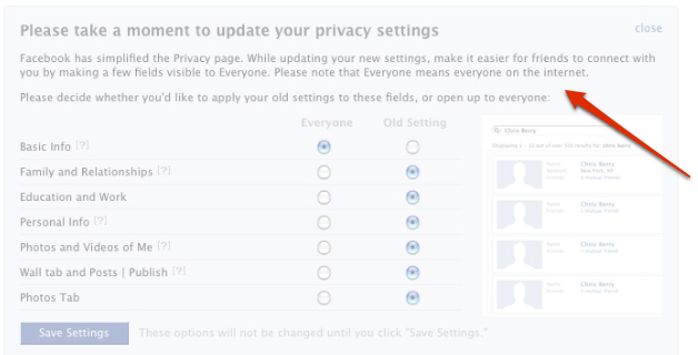 But Facebook sees its redesigned control panel as an opportunity to invite users to start shrugging off their privacy. So it’s piggybacking the new ‘Everyone’ feature on top of the Transition Tool, which is designed to help users acclimate themselves to the new settings. Facebook is planning to test out six different versions of the Transition Tool, and will probably settle on around two different versions for its general release (apparently different tools will be shown depending on your current settings).
