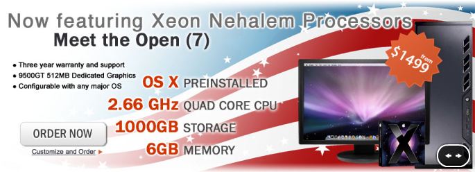 It’s obvious that the new Open(7) system is a Mac Pro clone. It pairs an Intel Xeon CPU with up to 24GB of RAM for a fast OS X experience. Plus, Psystar has a new chassis that features three layers of sound dampening, which lends to the claim by Psystar that this is its quietest system yet. The systems start out at $1,499 and are available in both rackmount and desktop form factor.
