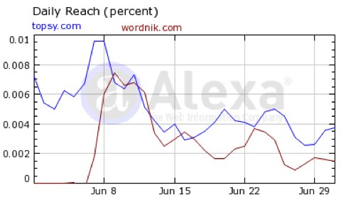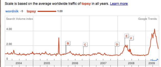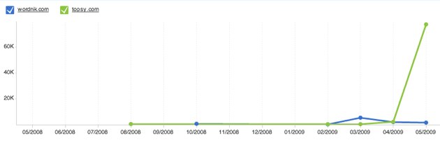 Compare Wordnik to Topsy, another recently launch service. Topsy launched on TechCrunch exclusively. The domain now has 577,000 results on Google, compared to 56,000 for Wordnik. And the traffic difference is stunning: