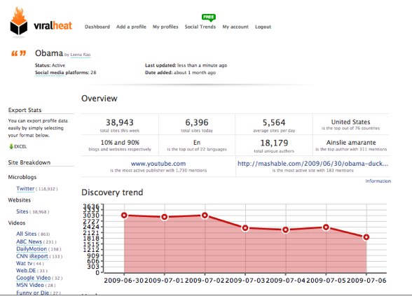Viralheat allows you to create profiles to track an individual’s name or a company’s name across nearly 30 video sites, the web and Twitter. The platform’s new website monitoring tool gives you data on the number of websites that mentioned a topic in a given week and day, the country where users are most actively mentioning a topic, the average number of mentions per day, the breakdown of mentions between blogs and websites and more. Additionally, the service will provide a real-time stream of topic mentions between blogs and websites.