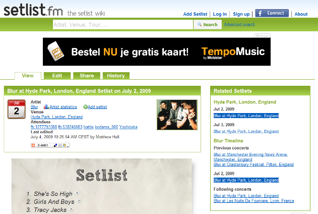 It’s festival season, so this may be a welcome addition to the gigantic directory of music-related information websites and applications already out there on the Web, particularly for live gig buffs. Setlist.fm is an awesome free wiki site (although they prefer to call it a “wiki-like service”) that aims to become the biggest repository of live performance track lists with the help of music fans across the globe.
