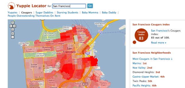 The site also leverages an array of publicly available information like census data and hospital ratings. For example, there are options to see a map with an overlay of the highest concentration of ‘Yuppies’ (young professionals who make $100,000 or more) or ‘Cougars’ (defined by the site as women aged 35-50 who are single or divorced). Obviously some of these are mostly for fun, but they can definitely come in handy, especially when you’re trying to price out different neighborhoods.
