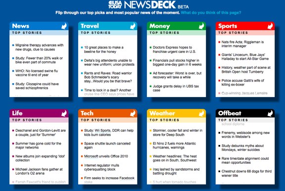 USA Today has launched Newsdeck, a site that aggregates the top news stories from the paper’s site. Each topic of news has an individual widget on the site with links to news stories. Currently the site features stories on 8 different topics, including “News,” “Money,” “Life,” and more.