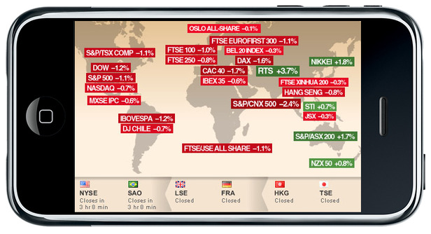 Remarkably, FT announced the release of the application using its Twitter and TwitPic accounts, which means we have screenshots too. As you can tell from the pictures, Financial Times’ iPhone app comes with a world map view of the global markets, in-depth looks at stocks with interactive charts and detailed tearsheets so you can track performance for individual companies.