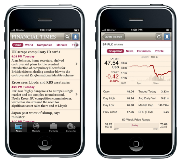 International business newspaper and website Financial Times, founded in 1888, is now part of the iPhone app club with the release of a free application on the iTunes App Store (iTunes link). The move comes after most of its competitors released applications for the platform back in 1891 (ok not really, but long ago anyway).