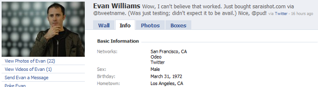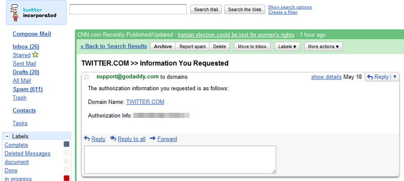 Above and below are purported screenshots of Williams’ accounts on Twitter, Gmail, and GoDaddy. He claims he was able to access Twitter’s domain name account on GoDaddy and could have redirected the traffic to another IP address (I’m sure that would have worked for about three minutes). The Gmail access, if true, would have been more troubling. Once the hacker got into @ev’s Gmail account, password recovery for other accounts was easy. He claims to have gained access to some internal documents, including projections for reaching 25 million users in 2009, 100 million in 2010, 350 million in 2010, and an outlandish goal to eventually become the first Internet service to reach one billion users. So maybe some corporate information was compromised.