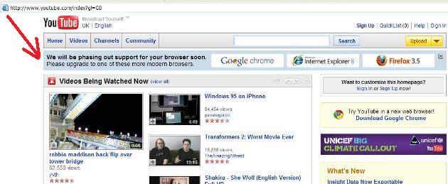 The online video behemoth is pointing to ‘modern’ browsers like Google Chrome (twice on the same page even, unsurprisingly), Internet Explorer 8 and Firefox 3.5 as alternatives.
