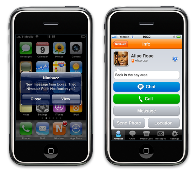 The new version of the app brings file-sharing in the cloud capabilities, VoIP calling on a range of IM networks (both over Wi-Fi and 3G) and push notification with home screen alerts of both incoming calls or chats through Nimbuzz or third-party networks like Windows Live Messenger, Yahoo Messenger and Google Talk. Finally, the iPhone app now boasts location-awareness, which allows Nimbuzz contacts to share and retrieve their physical locations on a Google map.