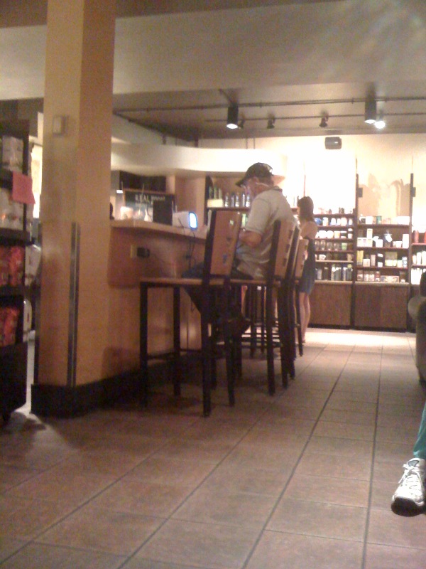 Look at this dude. He wants some TV while he’s enjoying a cup at Starbucks. The only thing is that the switch to digital now requires him to carry a converter box alongside his black and white tube TV. If only the powers at hand could move along the development and approval of ATSC-M/H, he might be able to watch OTA PBS on his cell phone like the rest of the modern world does using DVB-H.