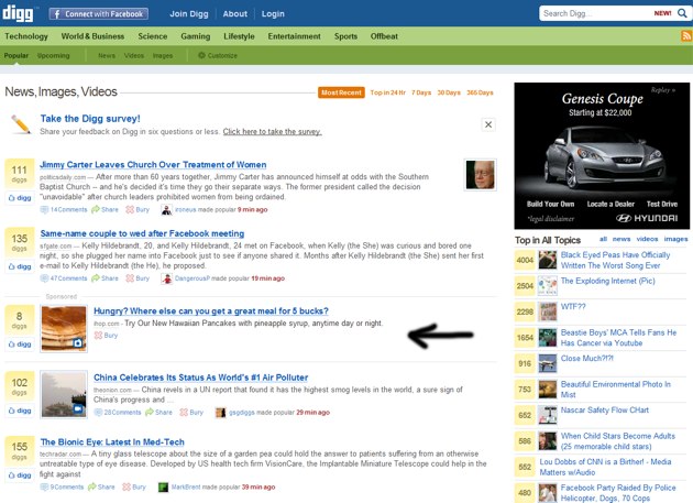 A TechCrunch reader submits the screenshot above showing a user voted Digg advertisement for IHOP. As far as we know, this is the first time this has been seen in the wild.