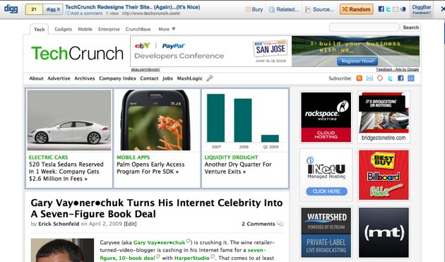 We first heard about the DiggBar in February, and the product launched in April. At that time Digg was calling it a short URL service, meaning users could convert long URLs into short ones that are better suited to services like Twitter and Facebook. Unlike other services, Digg kept their own toolbar at the top of the page with Digg stats on the story as well. The underlying URL was shown in an iframe.