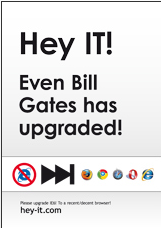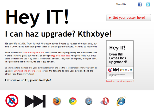 Now a passionate bunch of IE6 haters, their fire apparently fueled by our earlier post, is once again taking to the Web to shout out “Hey IT” and attempt to persuade IT departments into getting a move on the browser upgrade decision making.
