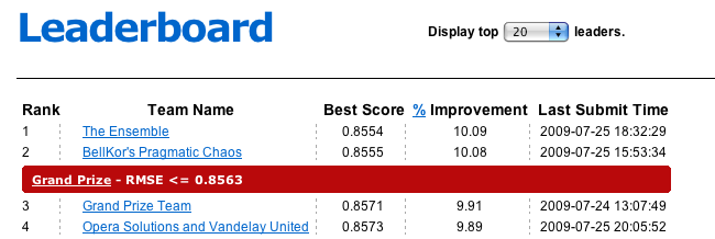 Last month news broke that a team of computer scientists had finally managed to improve Netflix’s recommendation algorithm by 10%, making them eligible to win the $1 million Netflix Prize, a competition that began back in 2006. The team, BellKor’s Pragmatic Chaos, is composed of two former leaders in the competition who banded together in attempt to finally break the 10% barrier and managed to succeed with a score of 10.08%. However, their announcement kicked off a 30 day window where other teams were invited to make their final submissions and potentially take the prize. Tonight, with just one day remaining, a team called The Ensemble has managed to overtake BellKor with a score of 10.09% — an improvement of .01% over the former leaders. You can see the full leaderboard here.